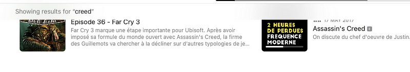 Non, mais à quoi sert ce bouton de recherche ? Je veux bien qu’Apple n’est pas Google, mais quand même ! En arriver à un point où la moitié des podcasts sont introuvable, c’est à croire qu’au donuts de Copernico, ils ont des équipes spécialisées en recherches merdiques.