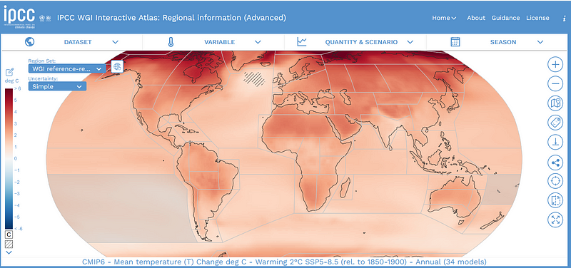 La première carte est simplement la carte du GIEC. Elle permet de simuler/voir les effets du changement climatique sur la température. C’est assez complexe à utiliser, mais sympa sy on veut s’y perdre quelques instants.