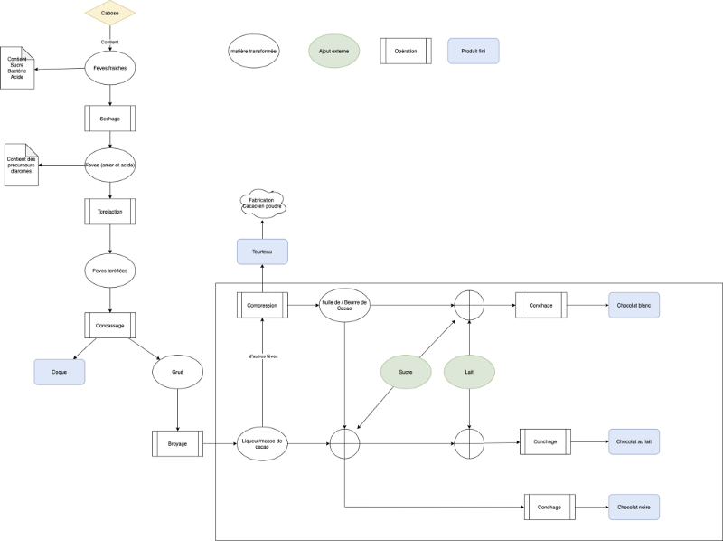 Le chocolat, qu’il soit noir, blanc, au lait, est avant tout un produit, c’est-à-dire qu’on part d’une matière première (la cabosse) et par un procédé industriel, cette matière première se transforme en chocolat. Il n’est pas nécessaire d’expliciter ici toutes les étapes de la fabrication du chocolat; nombre d’émissions l’ont fait et le feront mieux que moi. Par exemple c’est pas sorcier dans une émission postée le 29 mai 2013 sur YouTube ( https://youtu.be/-pfcvGtVwOM) explique point par point toues les transformations.
