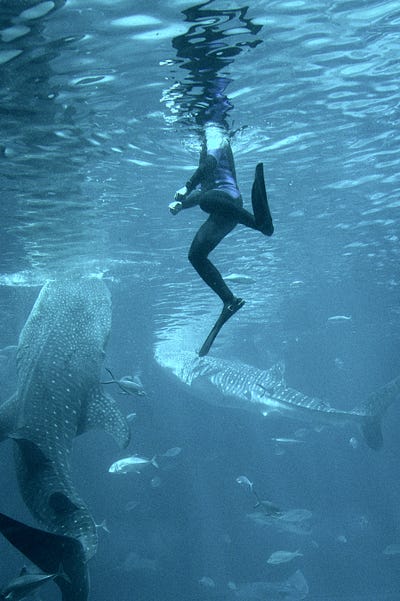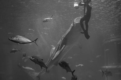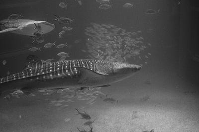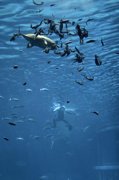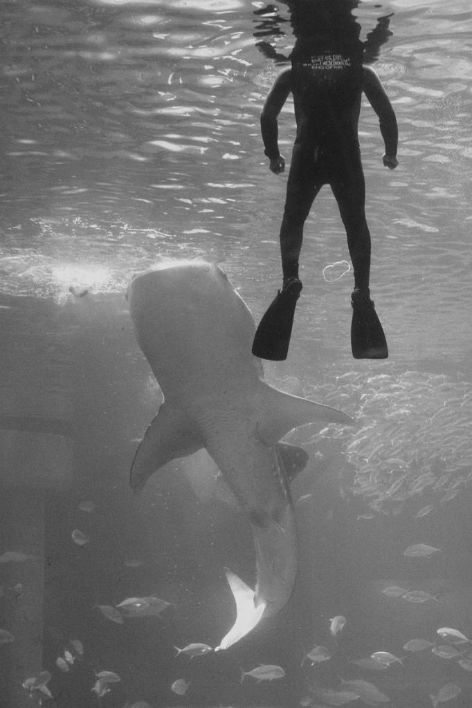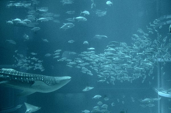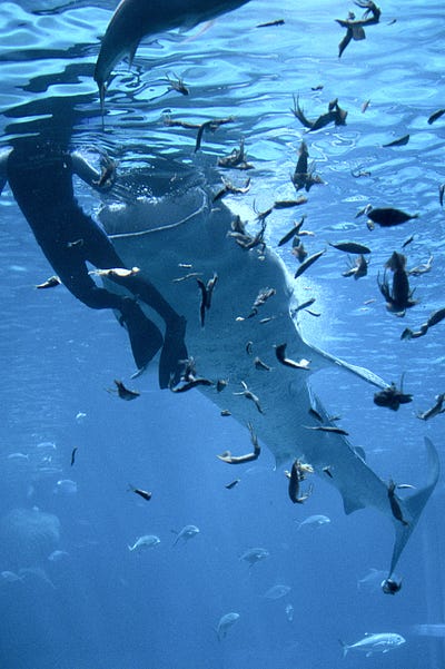 Petit calcul vite fait, mais sur internet, on parle d’un aquarium de 9 mètres par 35 mètres. Si on compte 2 mètres de plafond, et en arrondissant beaucoup, c’est comme si j’étais enfermé dans un 70 mètre carré. Et vraiment j’ai pris large. En fait, c’est mon appartement actuel… et je dois dire que j’y aurais beaucoup de mal à ne pas pouvoir sortir de mon appart de temps en temps. Sans compter que ce n’est pas une propriété privée, mais une colocation. Il y a deux requins-baleines, plusieurs raies mantas et des ordres de poissons.